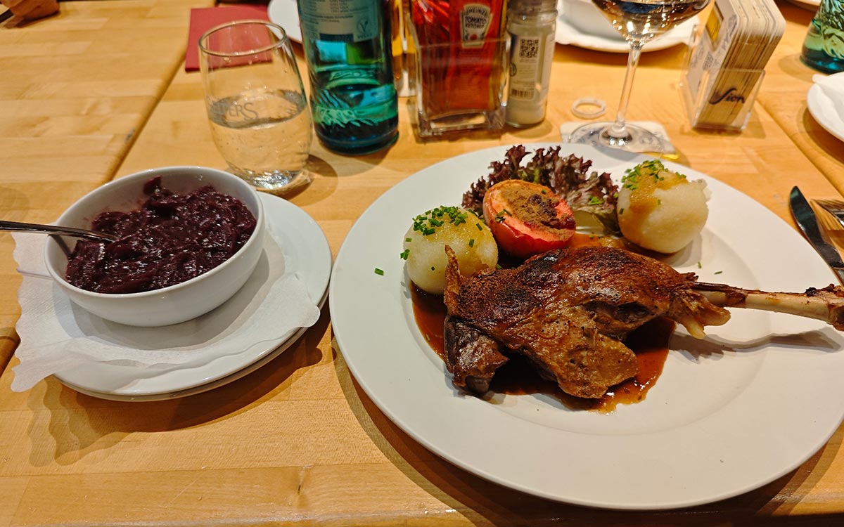 Anschließend sind wir am Friedensplatz ins Sudhaus gewechselt, um uns dort mit leckeren Speisen und Getränken verwöhnen zu lassen. Zu 11 Treffpunktmitgliedern einschließlich der Partner und Partnerinnen haben wir einen sehr schönen Abend verbracht: Die Gänsekeule schmeckte bestens, aber auch die anderen Gerichte waren gut zubereitet, und die Getränke hatten auch gemundet.