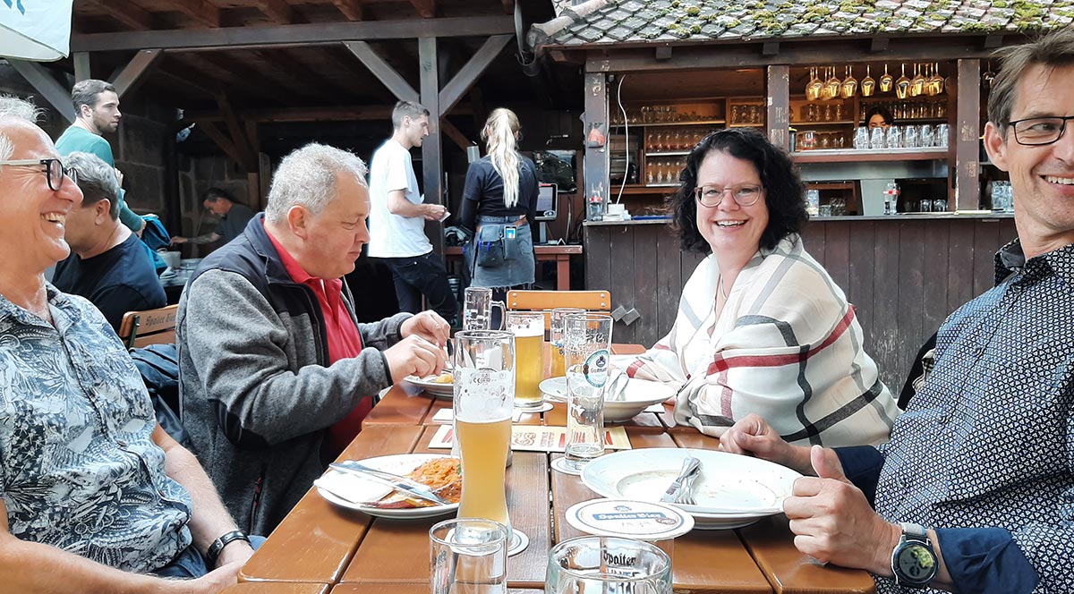 Die Stimmung in diesem historischen Restaurant mit Brauerei war hervorragend: Die Speisen waren bestens zubereitet, und auch die Getränke waren süffig. Natürlich konnte wieder viel geplaudert werden, aber auch „offizielle“ Themen wurden behandelt. So berichtete Günter über die fortschreitenden Vorbereitungen für die Jubiläums-MV im April 2026 zum 75-jährigen Jubiläum der VVB. Er verwies auf die laufend aktualisierten Neuigkeiten im VVB-Magazin wie zum Partner- bzw. Seniorenprogramm, dem Kommers usw. Es wäre schön, wenn auch einige Mitglieder aus Münster anreisen würden. Wir verbrachten einen sehr kurzweiligen Abend, und alle freuten sich, dass man sich wieder gesehen hatte.